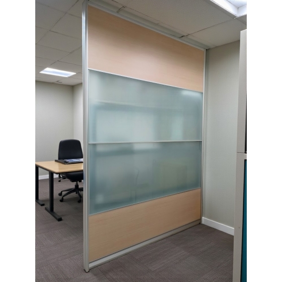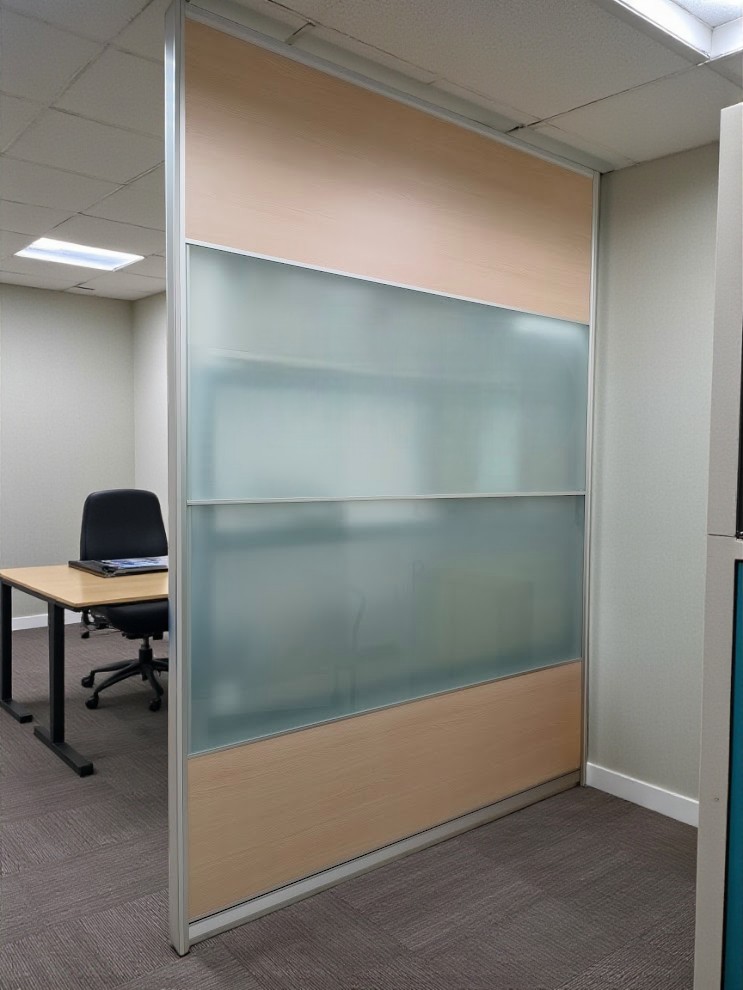 ▲ 木紋色塊狀隔間屏風+強化玻璃