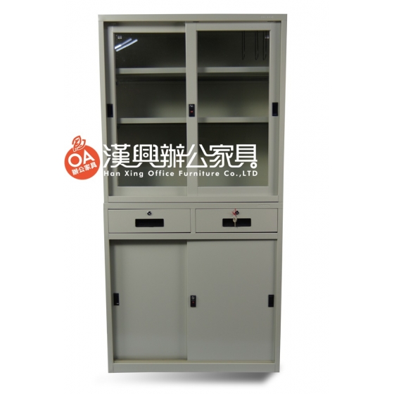 3尺上玻璃鐵櫃+下3尺中二抽屜鐵櫃