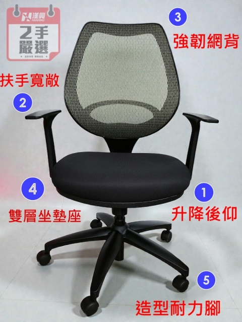 【 漢興專業二手OA 】人體工學強力網+功能扶手後仰椅